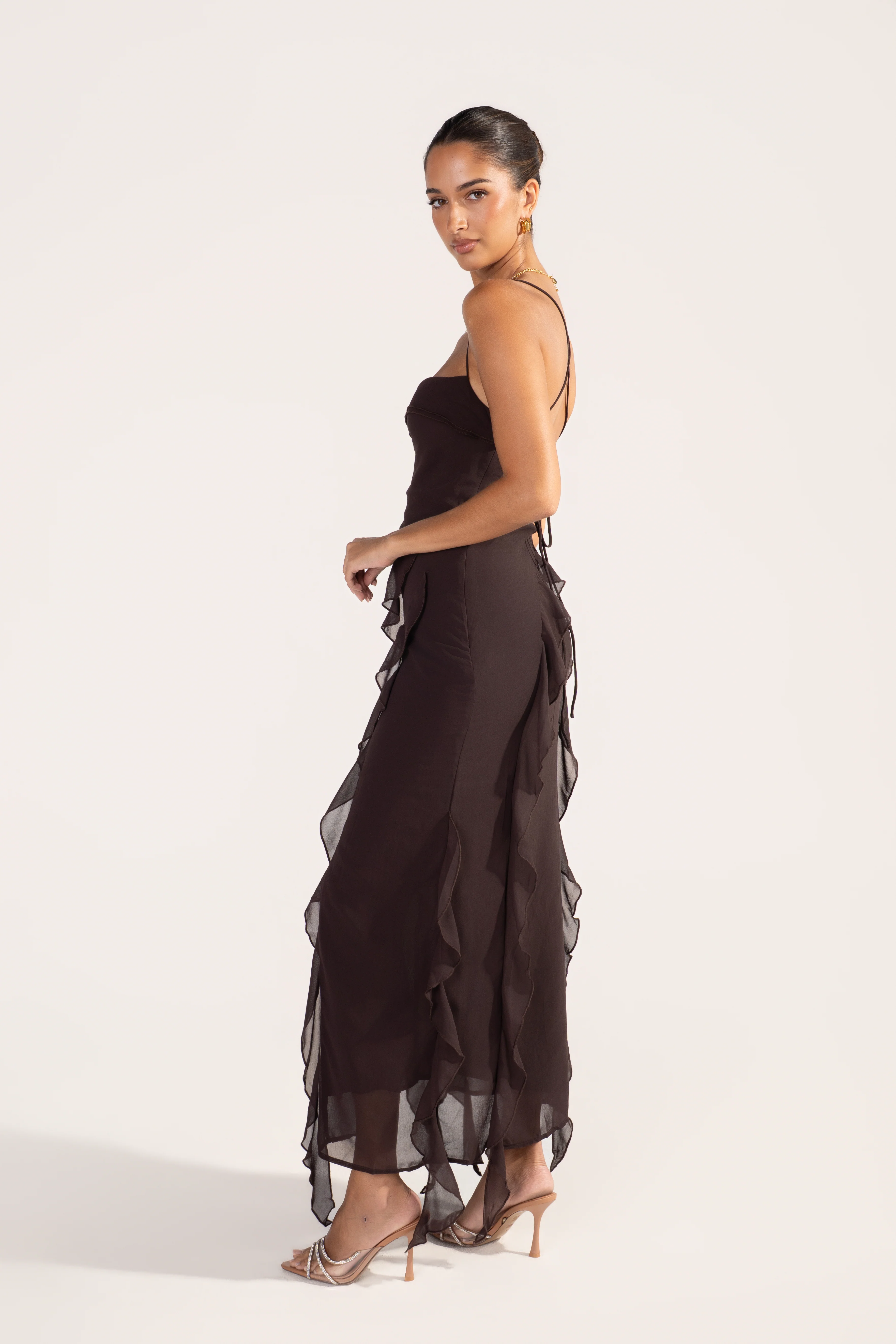 Step into a dream with the Charlene Dress, a romantic design adorned with gorgeous cross-back ties. This ethereal dress features cascading ruffle details that flow gracefully, adding a whimsical charm. The adjustable ties at the back not only create an elegant crisscross design but also allow for a customised fit. A side zipper closure ensures ease and comfort, while the delicate straps and open-back detail add an extra touch of allure. Perfect for garden parties, weddings, or special evenings, this dress combines romance and sophistication effortlessly.