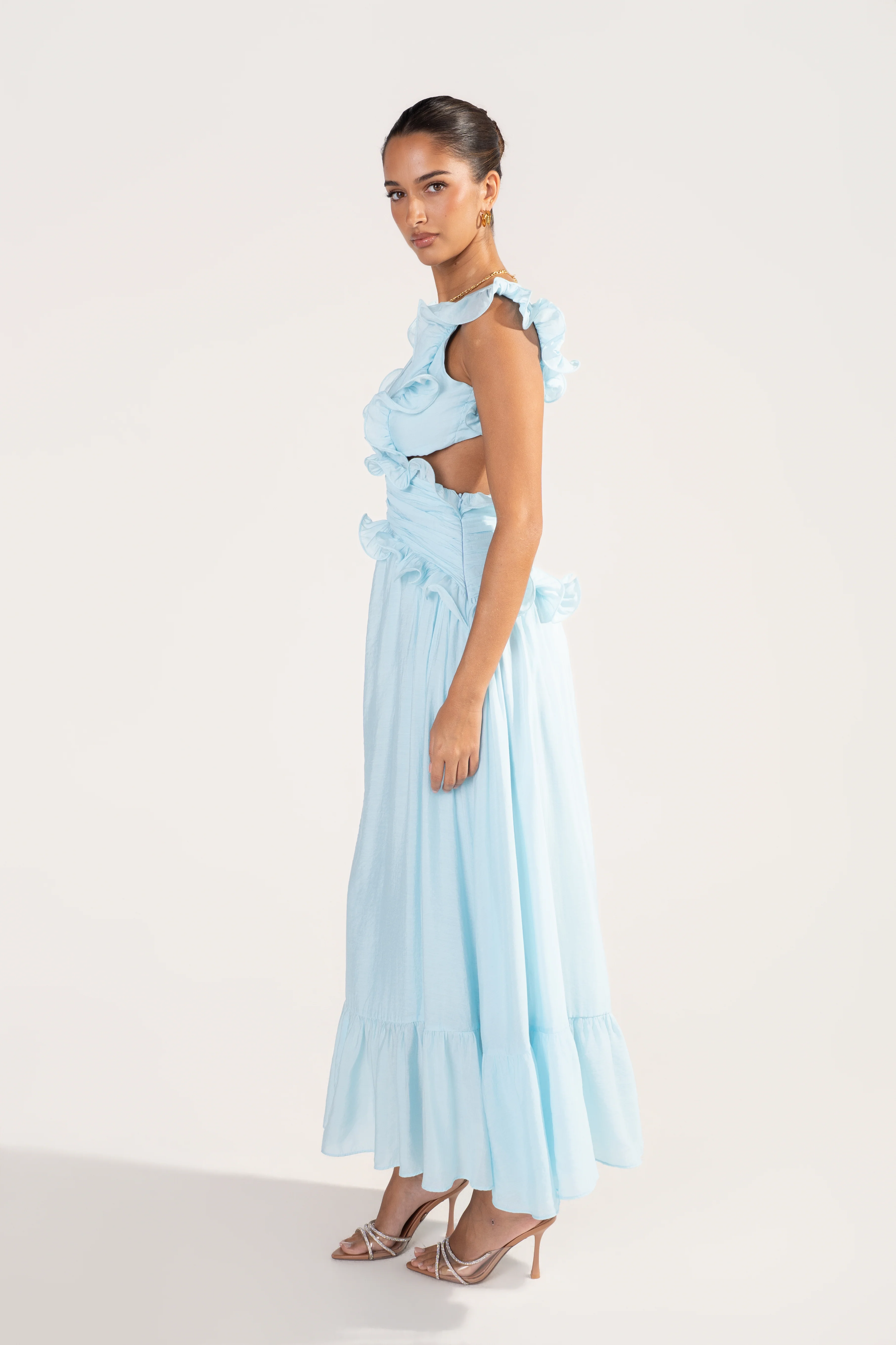Make a statement in this bold yet feminine Clarisse Dress. Designed with cascading ruffles along the deep V neckline and open back, this dress exudes effortless elegance. The fitted bodice features delicate ruching for a flattering silhouette, while the voluminous skirt adds movement to every step. A secure button closure at the back and a discreet side zipper ensure the perfect fit. Whether you're dressing up for an event or embracing a chic evening look, this piece is sure to turn heads.