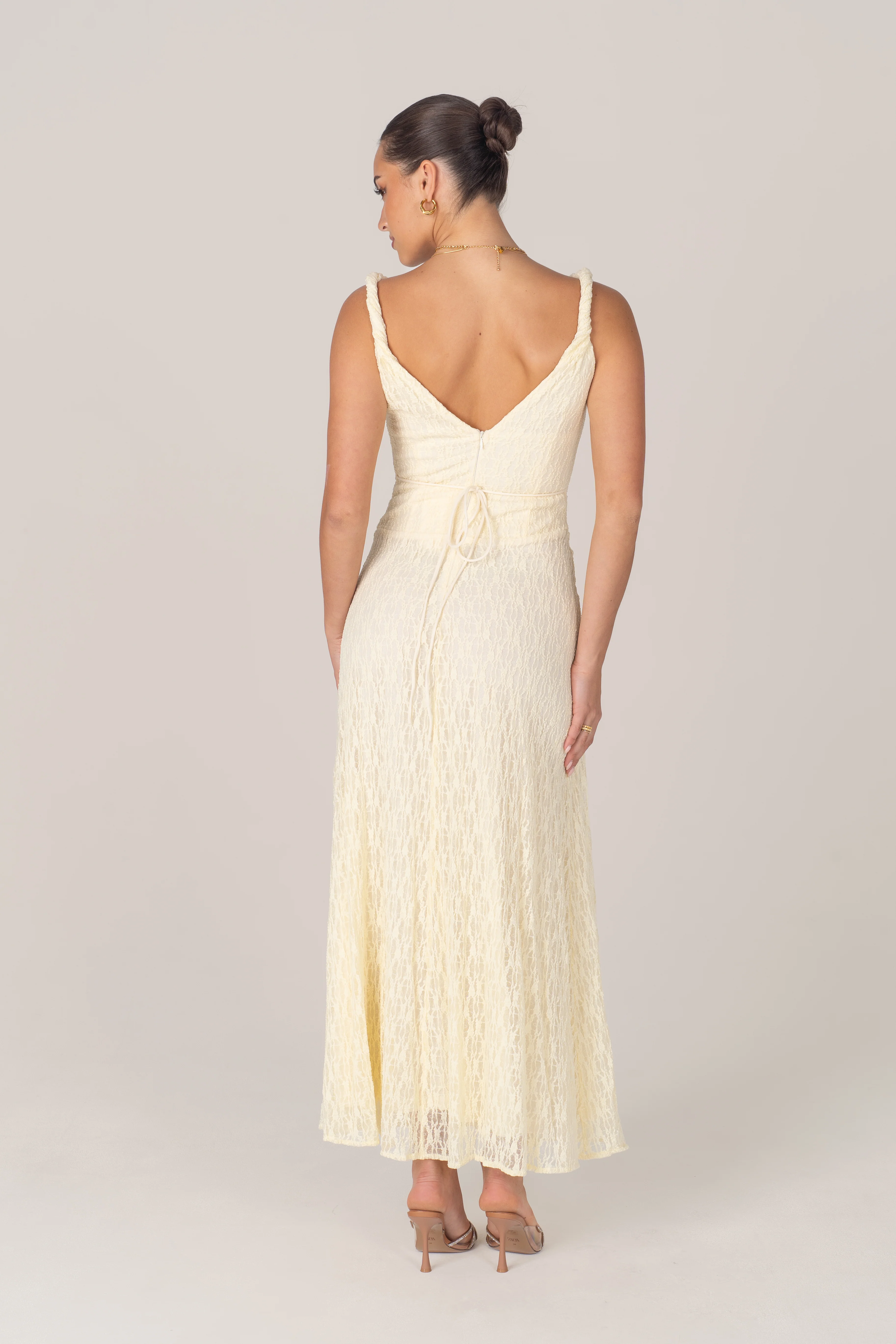 Delicate yet striking, this Delia Dress is designed with thoughtful details that elevate its charm. A straight, high neckline offers a refined silhouette, while the shoulder is accented with a knotted twist for a modern touch. The back reveals a daring V-shaped open cut, secured with a tie that adds both femininity and structure. Crafted from intricate lace, the dress features an asymmetrical design that flows with effortless grace. A concealed back zipper closure ensures a seamless finish, making this piece a perfect balance of sophistication and allure.