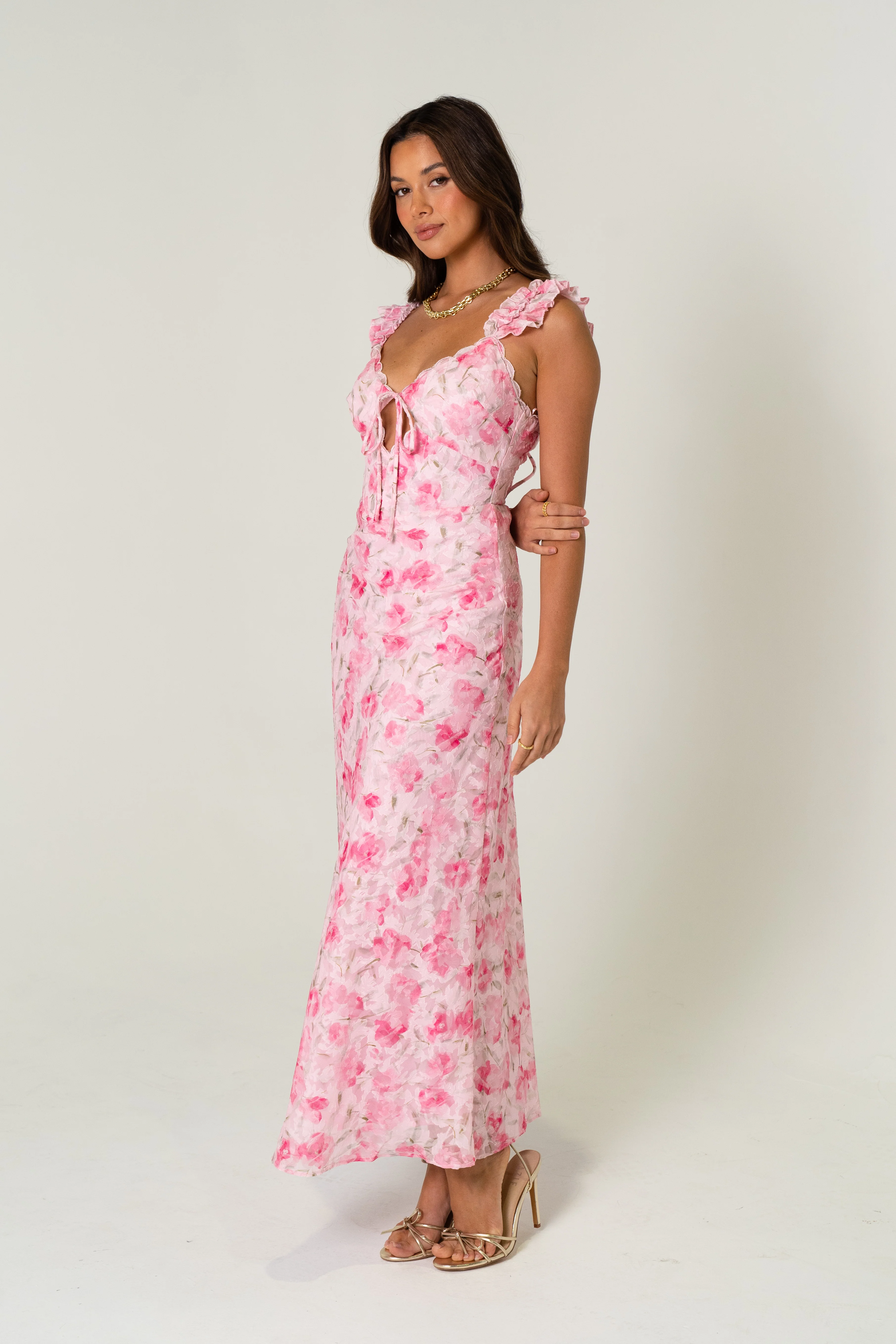 Introducing our Donna Dress – a sweet and feminine statement piece designed to captivate. This dress features delicate ruffled strap sleeves that add a playful touch. A charming bow tie sits gracefully at the bust, perfectly complemented by a small, flirty cutout just below, offering a subtle hint of allure.