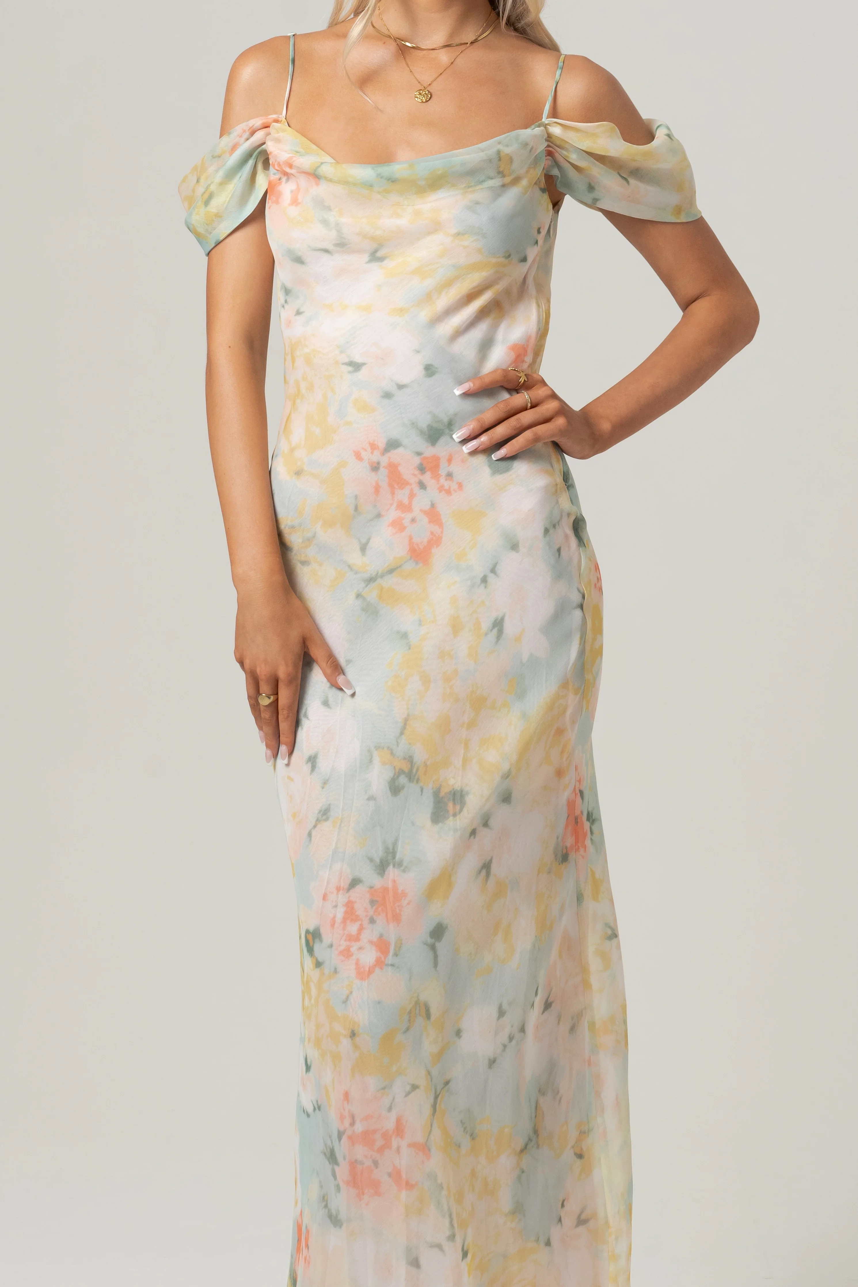 Introducing our enchanting Juliette Dress in our gorgeous prints, where elegance meets femininity in every stitch. This mid-to-maxi length dress features off shoulder draped sleeves as well as adjustable spaghetti straps to allow for a customised fit. It also features a cowl design at the back, encouraging the femininity of the dress. Designed to flatter every silhouette, the flowing silhouette of this dress cascades effortlessly, creating a mesmerising ethereal effect with every step you take.