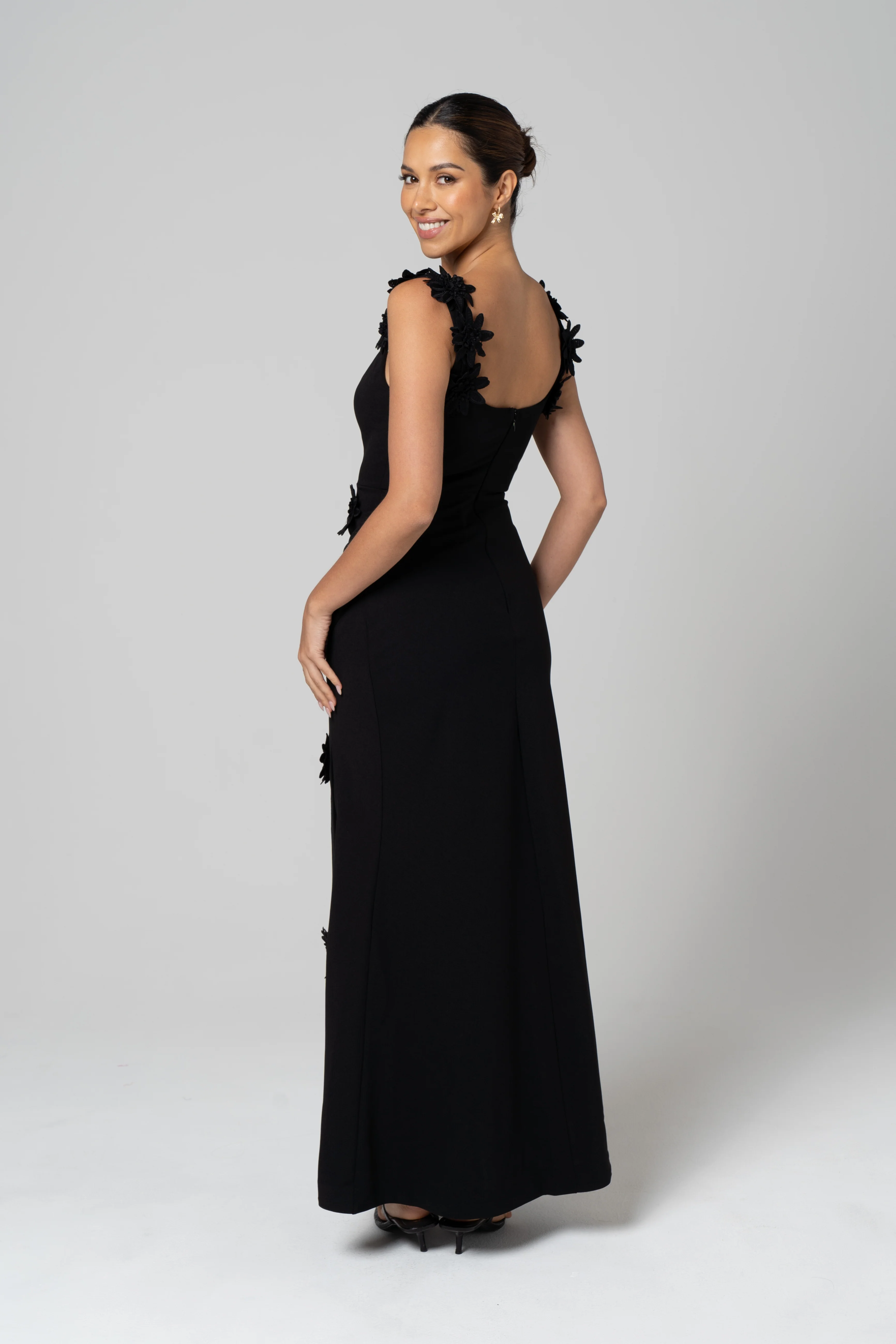 Turn heads in the Luciana Dress, a masterpiece of elegance and modern sophistication. This slim-fit maxi dress features a square neckline and a figure-hugging silhouette that flatters every curve. Delicately adorned with 3D floral appliqués cascading along the straps and skirt, this dress exudes charm and femininity. The back showcases a sleek concealed zipper closure for a flawless finish and easy wearability. With its subtle side slit for added allure, this gown is perfect for formal events, galas, or evening soirées. Style it with minimal jewellery and statement heels for a show-stopping look.
