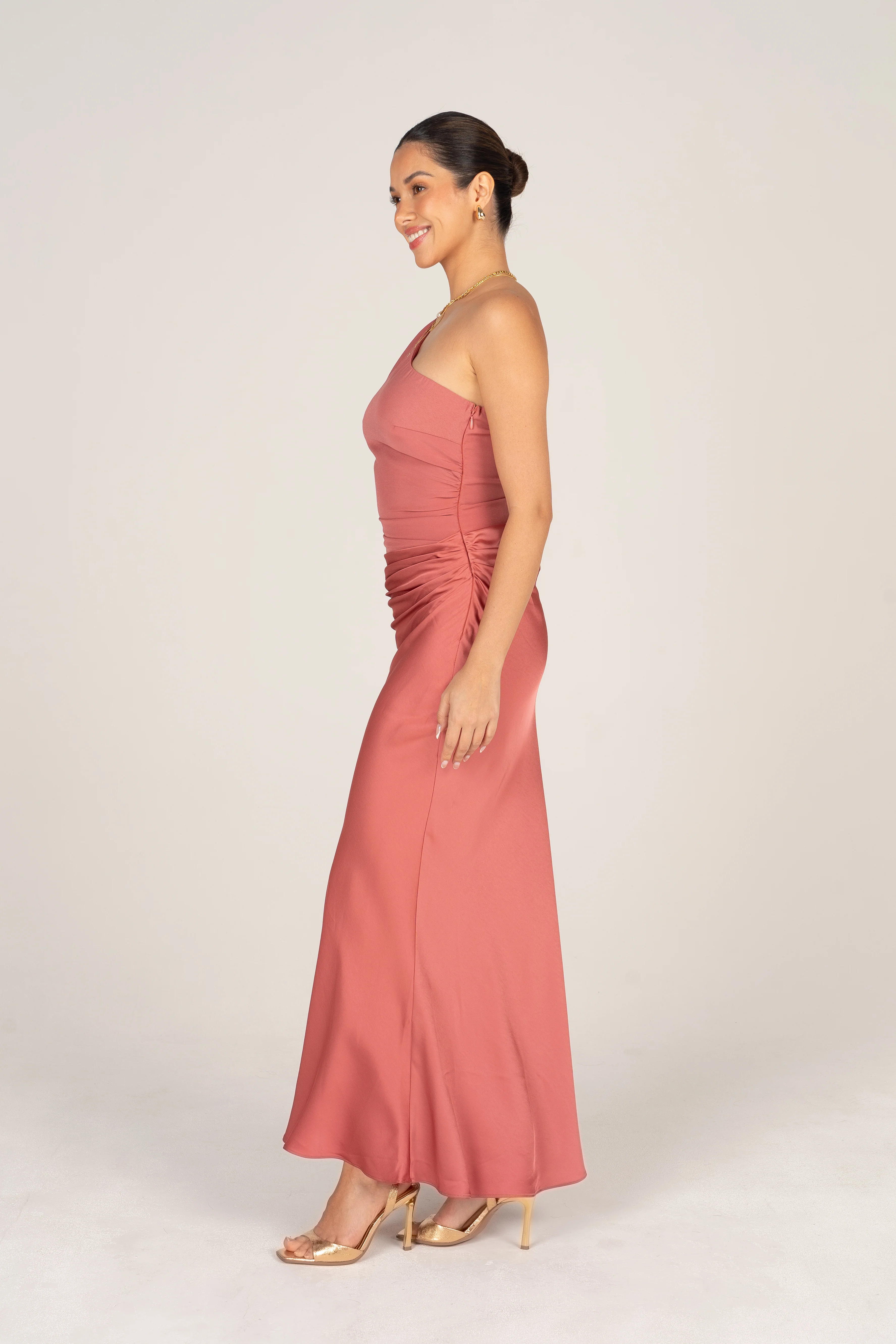This elegant rose-coloured Mackenzie Dress features a sophisticated one-shoulder design and a luxurious satin finish that catches the light beautifully. The waist ruching enhances your silhouette, while the flowing hemline adds graceful movement. A discreet side zipper ensures a seamless fit, making it an ideal choice for wedding guests seeking refined style and comfort.