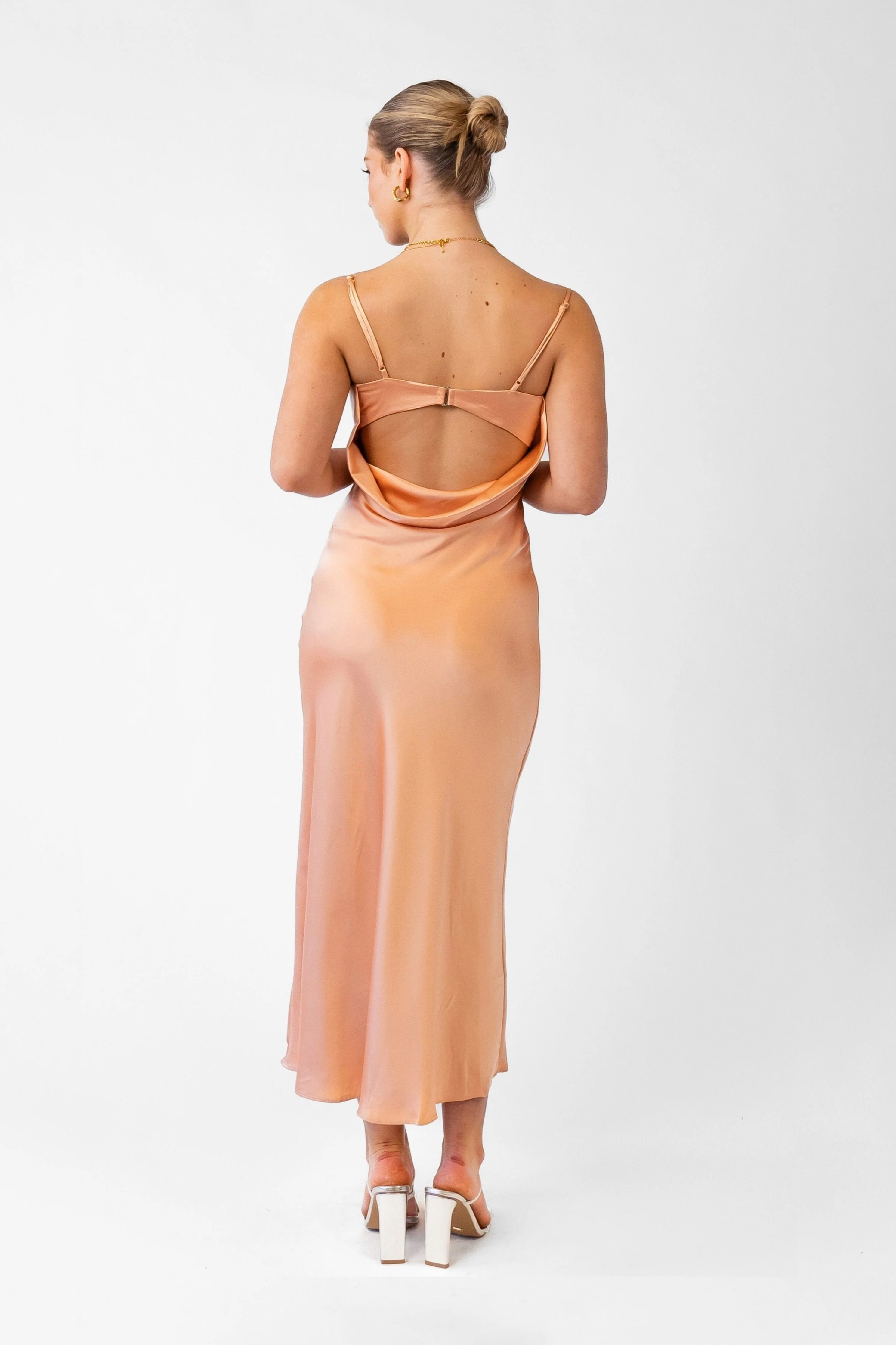 Exude effortless sophistication with the Maddy Dress. This luxurious slip dress features a sleek silhouette with a subtle sheen, perfect for any occasion that calls for understated elegance. The adjustable straps ensure a tailored fit, while the open back is secured with a delicate clasp at the centre, adding a touch of intrigue. The cowl drape at the back cascades beautifully for an elevated design detail. A discreet side zipper allows for seamless wear. Whether it's a wedding, cocktail party, or a special night out, this dress is your go-to for timeless glamour.