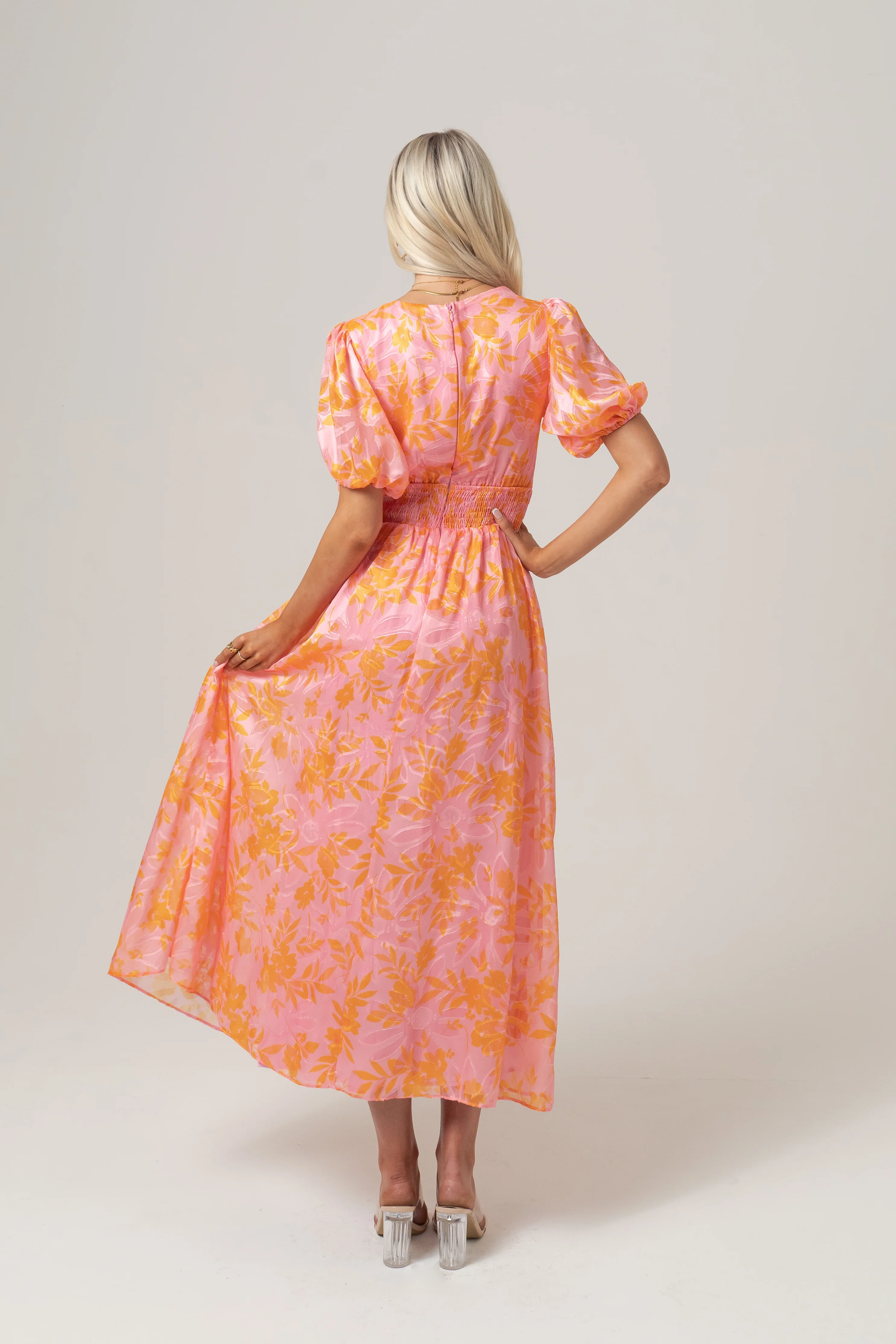 Madeline Pink Floral Print Midi Dress with Puff Sleeves