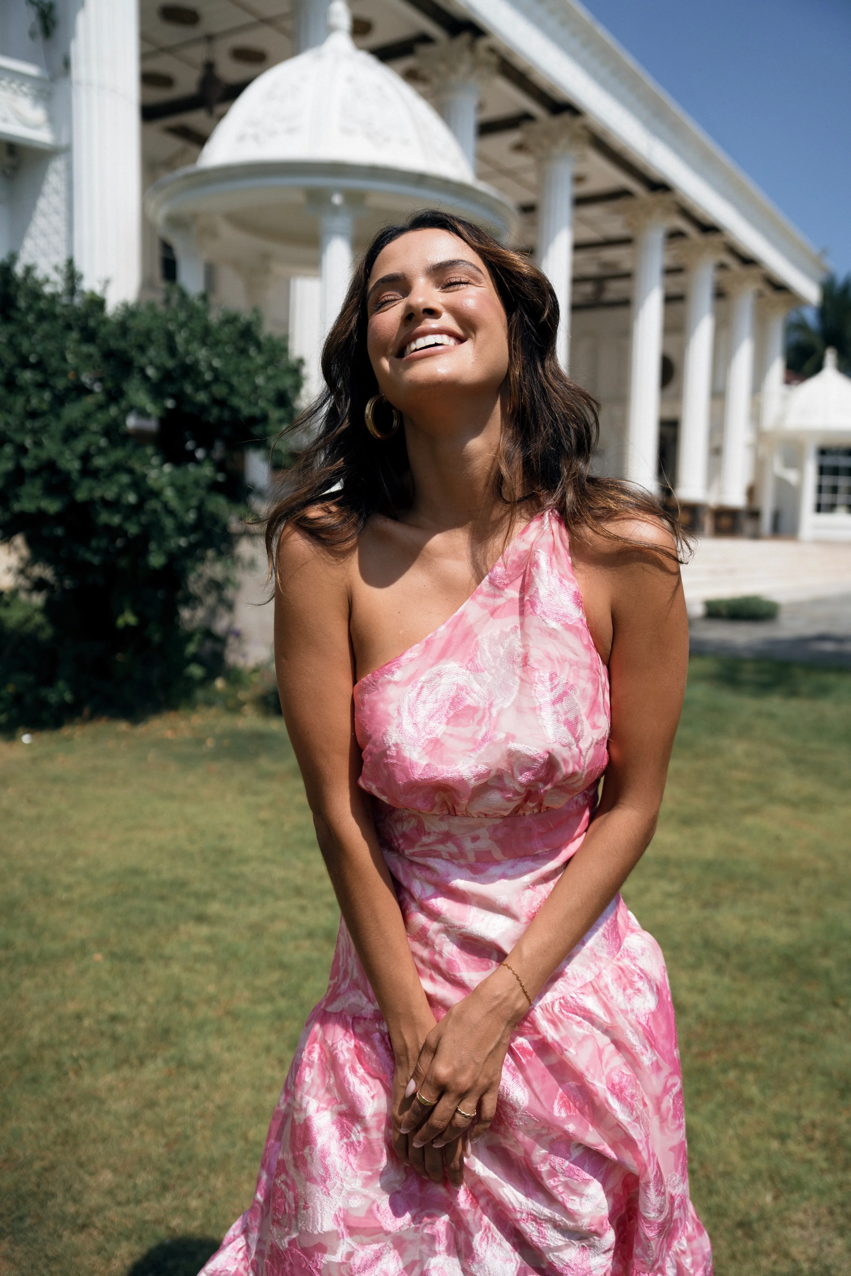 This one-shoulder Monica Dress is a stunning combination of elegance and modern flair. The standout knot detail at the shoulder adds a unique and stylish twist, while the cinched waist beautifully accentuates your figure. The dress then flows out gracefully, creating a flattering and feminine silhouette. A side zipper closure ensures a seamless fit, making it easy to slip into this effortlessly chic piece. Perfect for evening events or special occasions, this dress will make a bold yet refined statement with its timeless design and flattering shape.