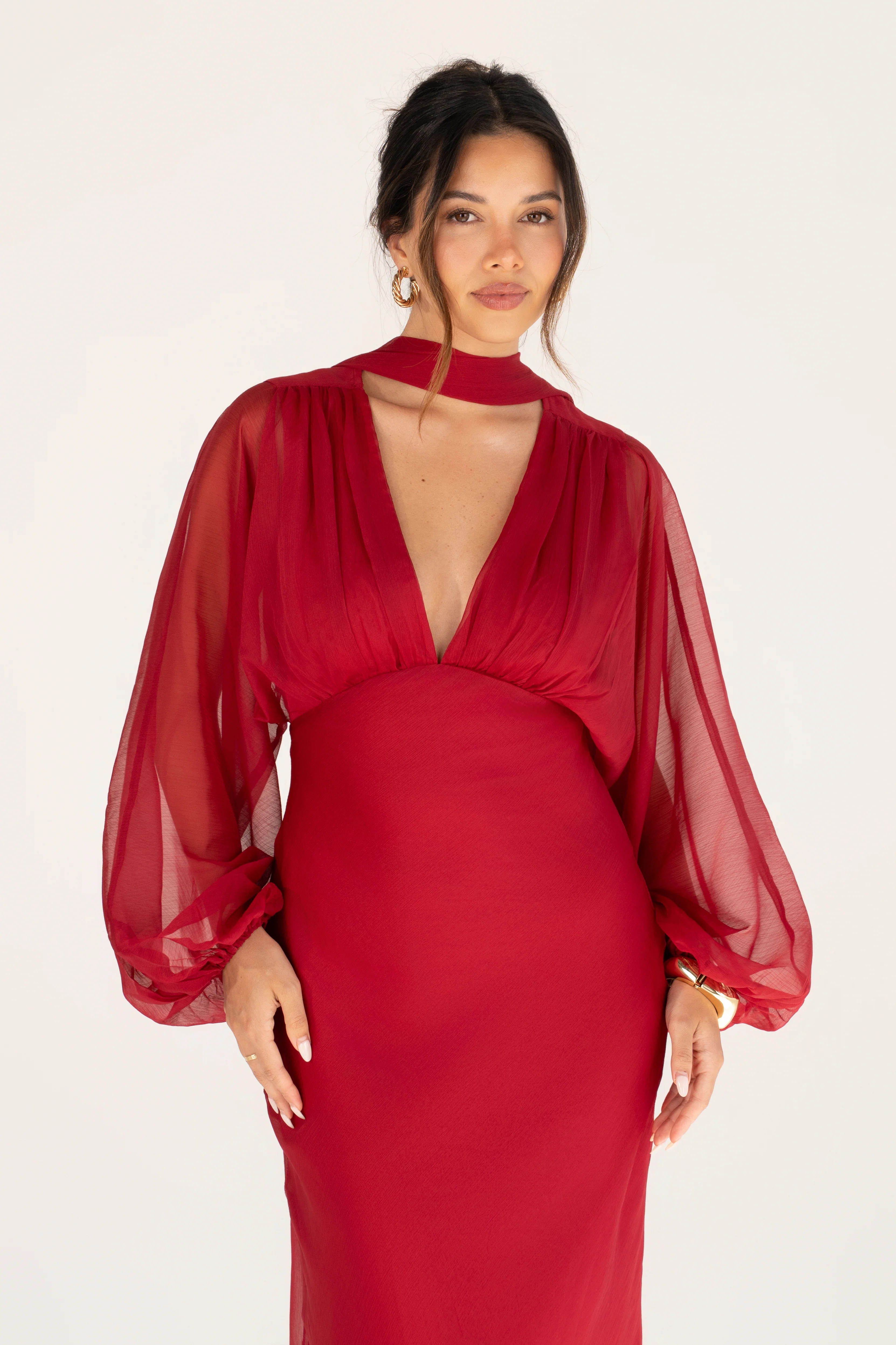 Effortlessly stylish and full of earthy charm, this Sabine Midi Dress blends soft femininity with a touch of wanderlust. Featuring sheer long sleeves for an ethereal, boho-chic finish and a detachable scarf that lets you style it your way—draped, tied, or removed entirely. A hidden back zipper ensures a seamless fit, while the flowing silhouette makes it perfect for sunlit days and breezy evenings. Pair with strappy sandals or boots for an easy, elevated look.