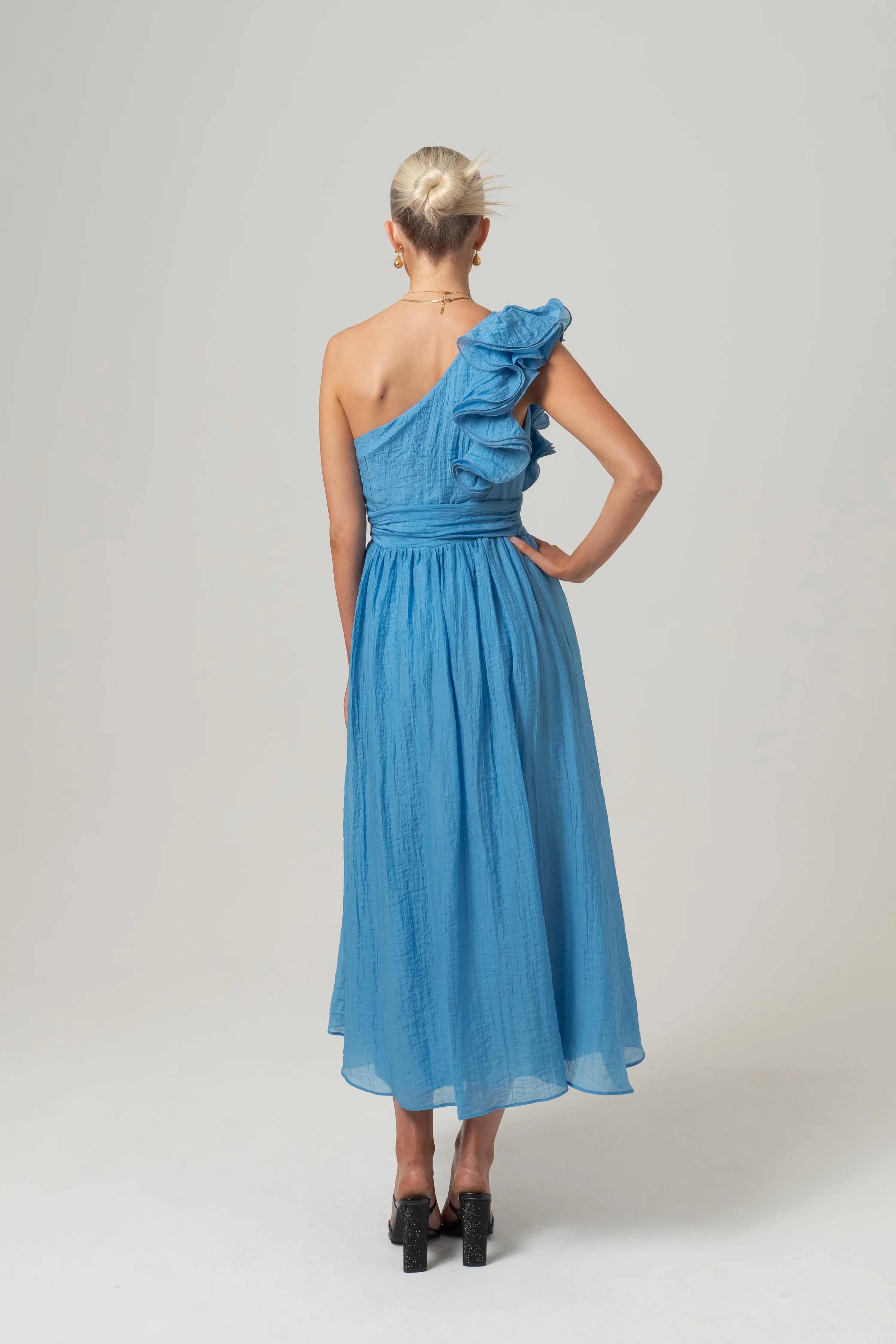 Make a statement with the Zara Dress, a stunning one-shoulder midi that embodies modern elegance. Featuring a standout ruffle shoulder detail, this dress adds a bold and feminine touch to your look. The cinched waist beautifully defines your silhouette, cascading into a flowing skirt that moves with effortless grace. Finished with a discreet side zipper for a seamless fit, the Zara Dress is perfect for weddings, cocktail parties, or any event where you want to leave a lasting impression.